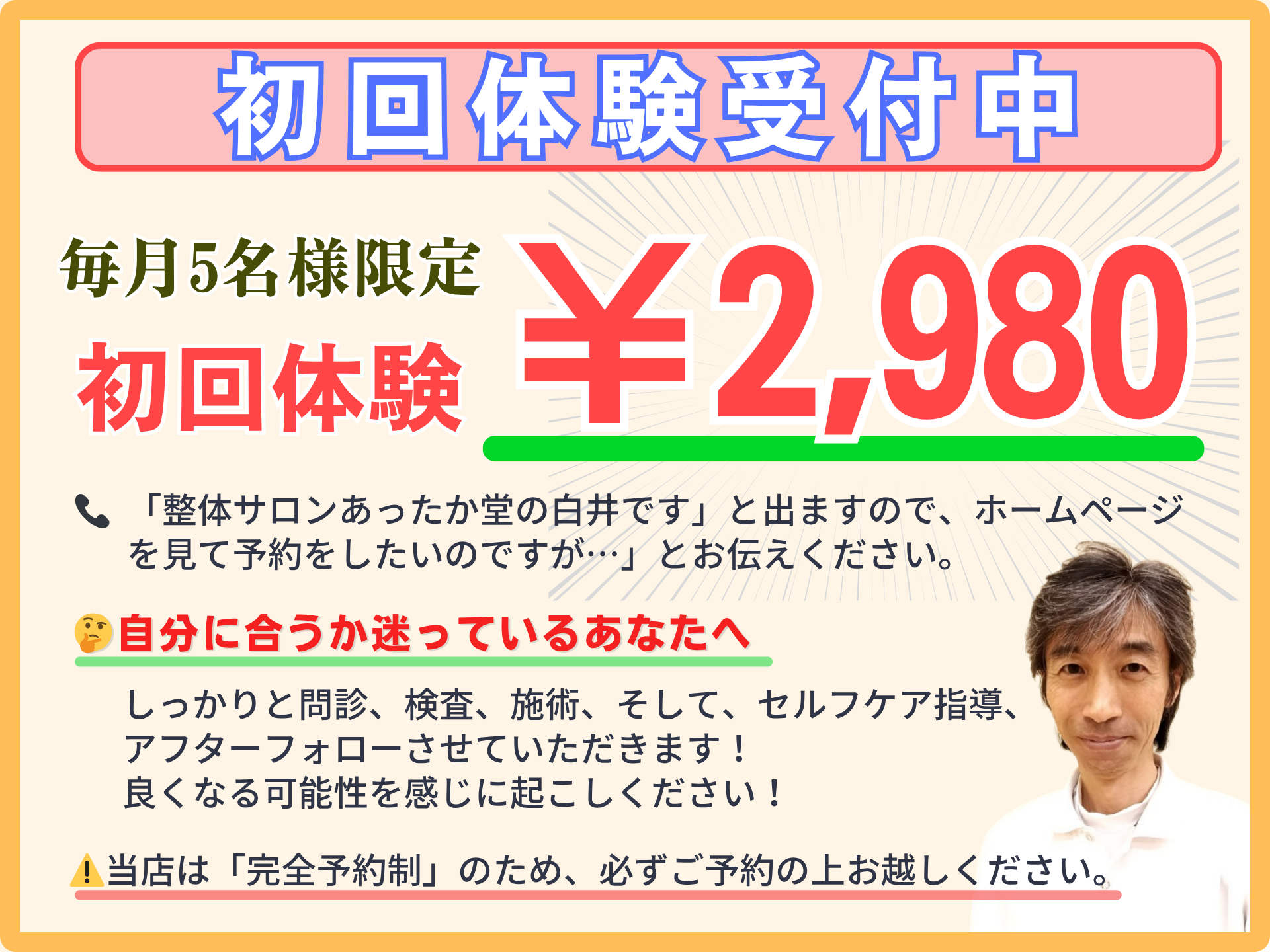 - 初回体験終了後は、通常初回価格11,000円(初見料3,000円+施術料8,000円)となります。